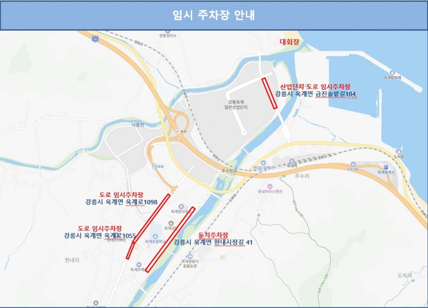 주차장 안내: 주수천 둔치 주차장(강릉시 옥계면 현내시장길 41) 및 옥계산업단지 도로변,